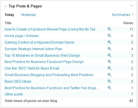 Blog statistics are a valuable source of actionable information. Review you statistics weekly when first starting out and at least every month once your blog is established. The  following overview of the WordPress Statistics Dashboard will help you get started in your quest for web relevance and expanded reach.