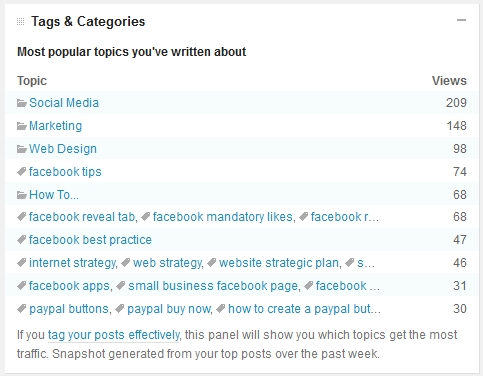 1. Tags and CategoriesCategories are indicated by a mini file folder and tags have a mini price tag icon. If you have articles that fall into natural categories it is a best practice to group them in this manner so that you can discover the most popular topics by various subject or keyword groupings.