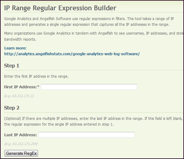 - Enter the beginning IP address and last IP address of the range to be filtered and click the “Generate RegEx” button